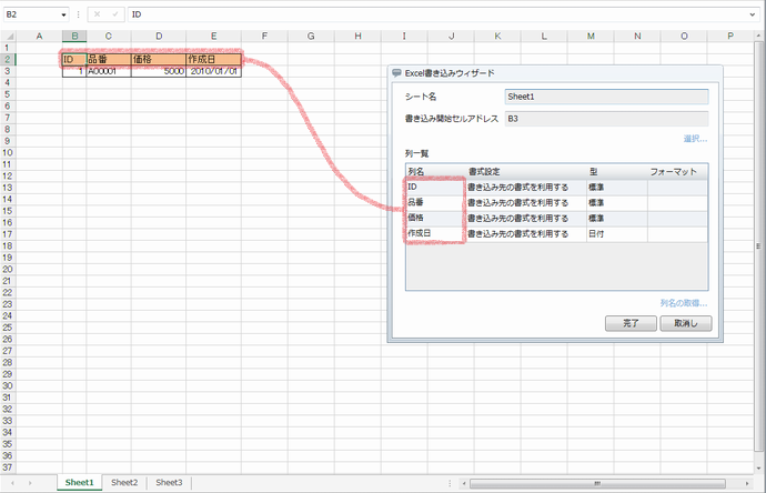 | 列一覧 | 書き込み範囲の選択で選択した列名・書式設定・型が表示されます。