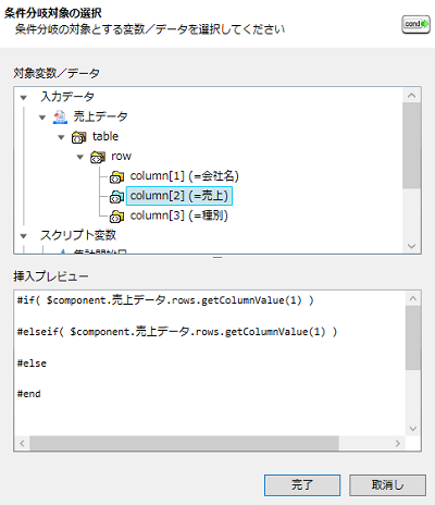 入力元の「スクリプト変数」ツリーから挿入するスクリプト変数をテンプレートエリアにドラッグ&ドロップし、表示されたメニューの[条件分岐処理の挿入]を選択することで、条件分岐処理を挿入することもできます。