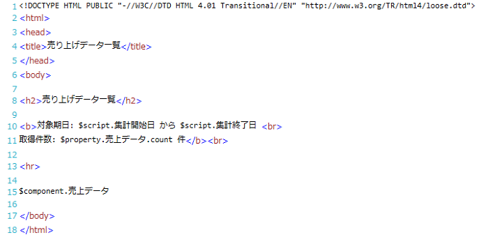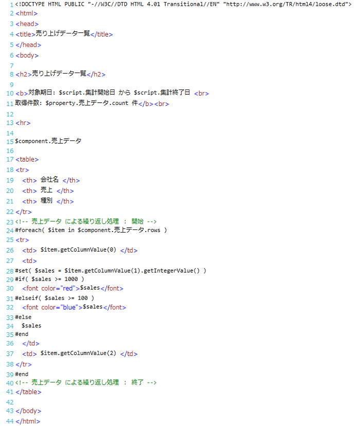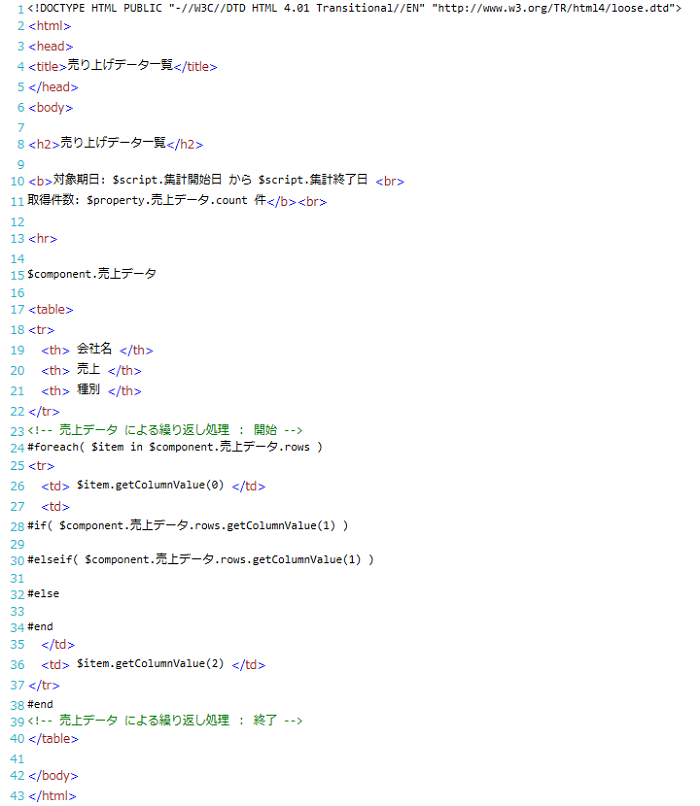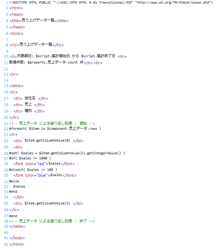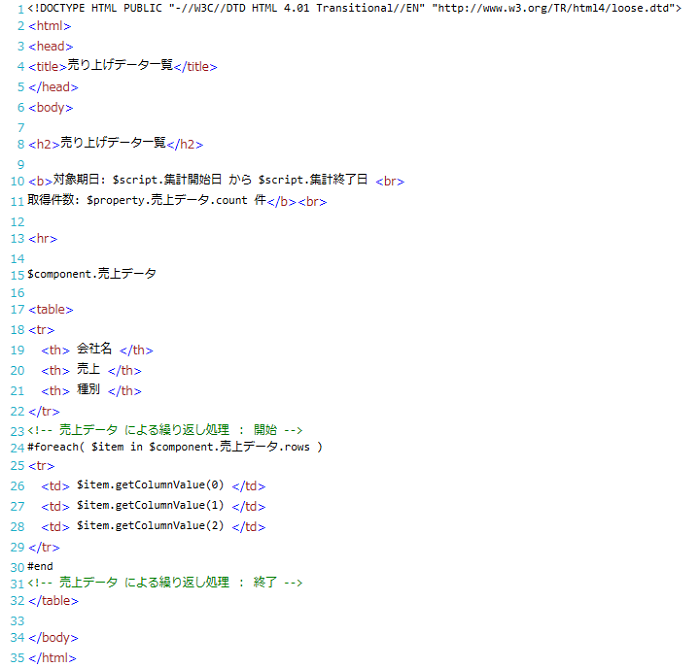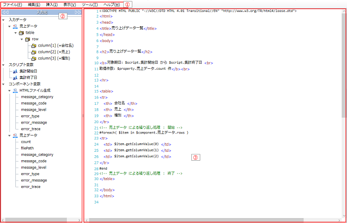 | (3) | テンプレートエリア | Velocityテンプレートを記述します。 タグやコメントはカラーリングされて表示されます。 |