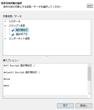 変数を用いた条件分岐処理については、「変数の使用方法」を参照してください。