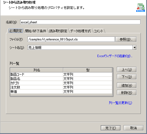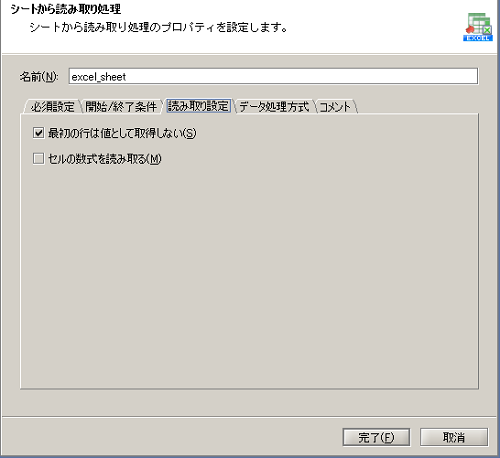 - シートから読み取り処理の設定は、以下のように行います。