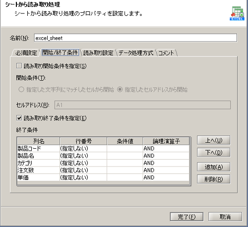Excelシートからレコードを抽出する際、null値のレコードになったら抽出処理を終了したい場合は、読み取り処理において[終了条件]を設定します。