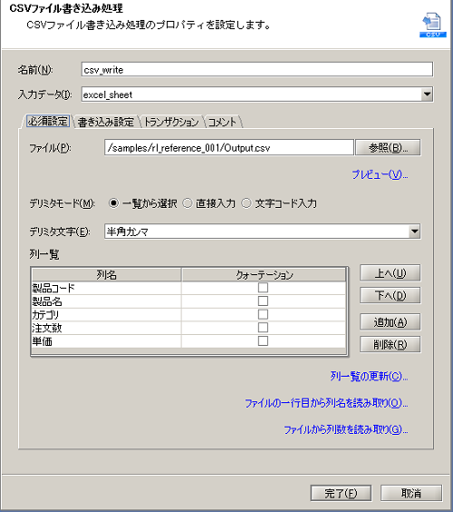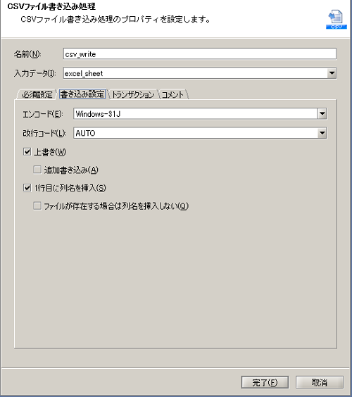 - CSVファイル書き込み処理の設定は、以下のように行います。