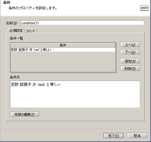 - 拡張子がそれ以外の場合、「例外通知処理」を使用して処理を異常終了させます。