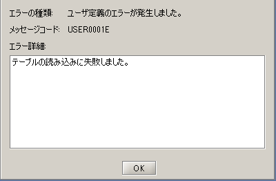 - テーブル読み取り処理で例外が発生した場合は、以下のダイアログが表示されて異常終了します。