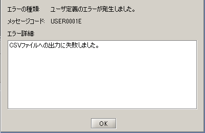 - CSVファイル書き込み処理で例外が発生した場合は、以下のダイアログが表示されて異常終了します。