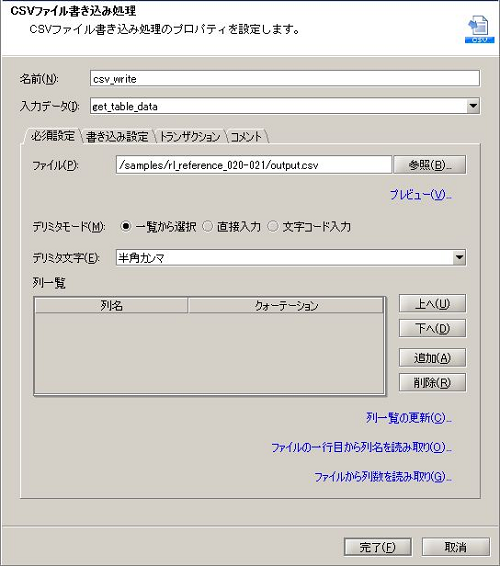 - CSVファイル書き込み処理の設定は、以下のように行います。