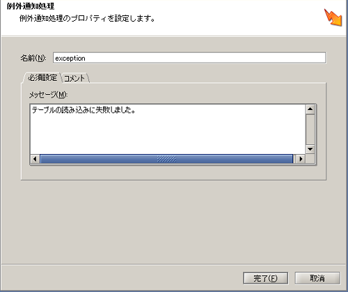 - 「テーブル読み取り処理」でエラーが発生した場合は、「例外通知処理」の[メッセージ]に設定した「テーブルの読み込みに失敗しました。」を通知して、処理を異常終了させます。