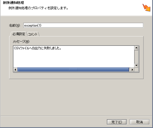 - 「CSVファイル書き込み処理」でエラーが発生した場合は、「例外通知処理」の[メッセージ]に設定した「CSVファイルへの出力に失敗しました。」を通知して、処理を異常終了させます。