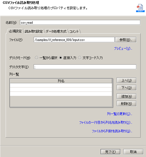| CSVファイル読み取り処理 | CSV(Comma Separated Values)形式、TSV(Tab Separated Values)形式などの形式のファイルを読み取ります。 | 「ファイル」-「CSV」-「CSVファイル読み取り」 |
