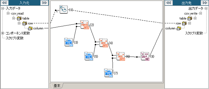 「数値」-「基本」-「数値定数」 | (8) | 日時フォーマッティング | 入力日時を指定したフォーマットで出力します。 [必須設定]タブの[フォーマット]には「yyyy/MM/dd」を入力します。 |