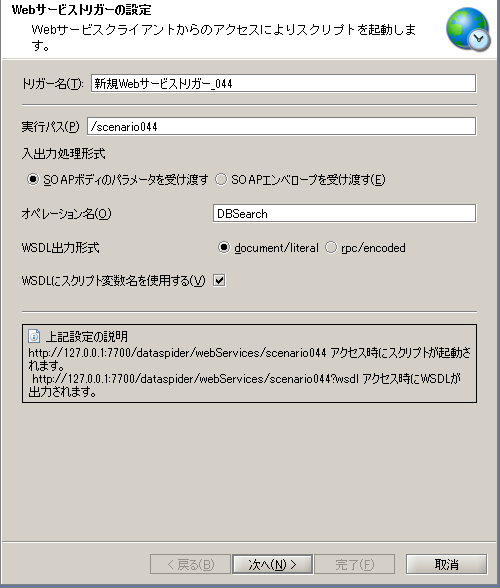 データベース検索処理をSOAPのWebサービスとして公開したい場合、Webサービストリガーを使用して公開します。