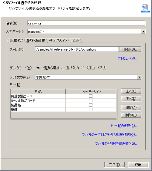- CSVファイル書き込み処理の設定は、以下のように行います。
