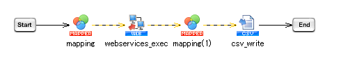 - マッピング処理(「mapping(1)」)のMapperエディタを開き、Webサービス実行処理の実行結果からCSVファイル書き込み処理の入力スキーマにマッピングする処理を作成します。