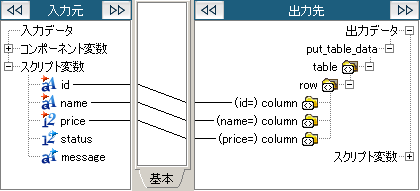 - マッピング処理のMapperエディタを開き、スクリプト入力変数の値をテーブル書き込み処理の入力スキーマにマッピングする処理を作成します。