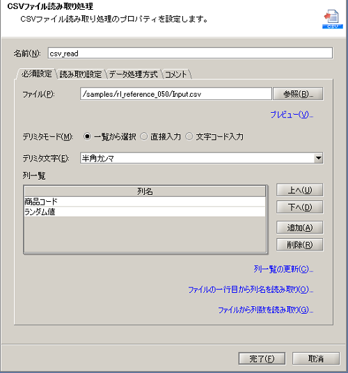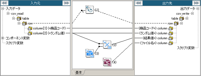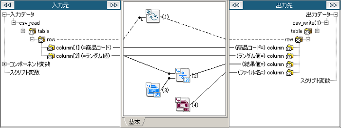 | (4) | 単一行文字列定数 | 単一行の文字列定数を出力します。 [必須設定]タブの[一行文字列]は「Output1.csv」を設定します。 |