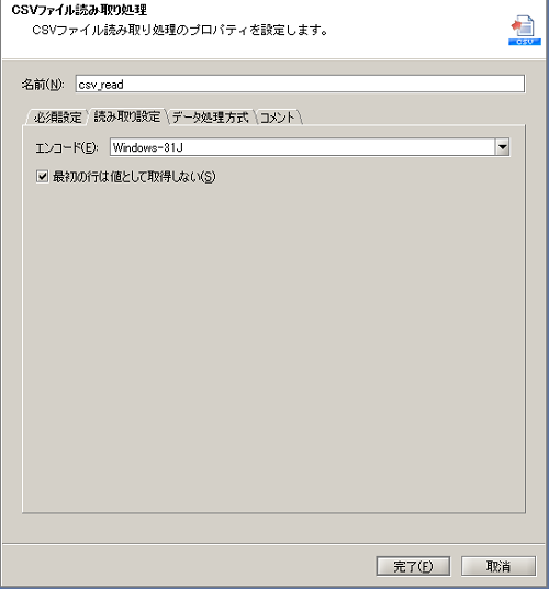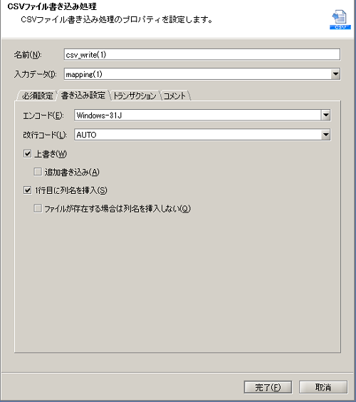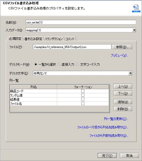| (4) | 単一行文字列定数 | 単一行の文字列定数を出力します。 [必須設定]タブの[一行文字列]は「Output2.csv」を設定します。 |