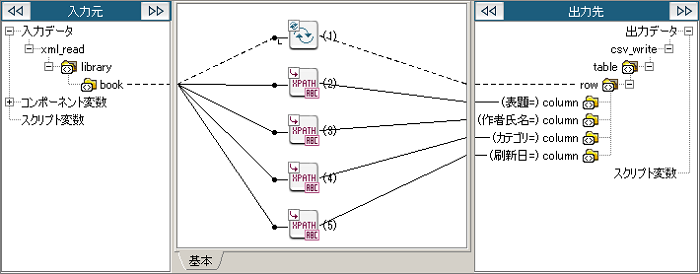 | (5) | XPathによる値の取得 | XPathにより値を取得します。 [XPath式]には入力元の要素「book」からの相対パスである以下の値を入力します。