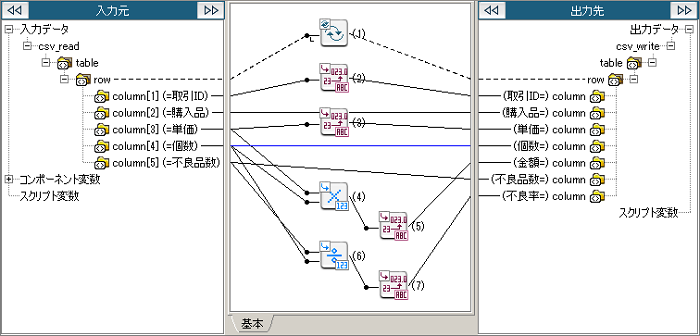 | (7) | 数値フォーマッティング | 入力数値を指定したフォーマット(DecimalFormat形式)で出力します。 パーセント符号付きの小数書式に変換するため、[フォーマット]には以下の値を入力します。