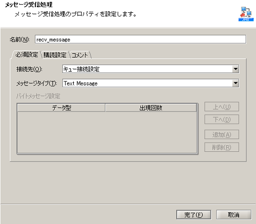 | メッセージ受信処理 | JMSプロバイダのサーバ上にあるキューまたはトピックからメッセージを受信します。 | 「ネットワーク」-「JMS」-「メッセージ受信」 |