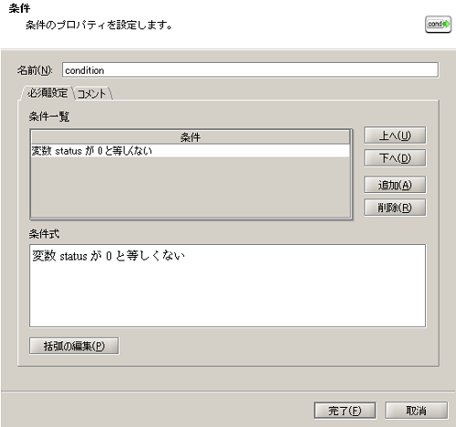 - Webサービスからの戻り値「status」の値が「0」以外の場合、「例外通知処理」で処理を異常終了させます。