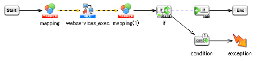 - マッピング処理(「mapping」)のMapperエディタを開き、Webサービスへ渡す値をWebサービス実行処理の入力スキーマにマッピングする処理を作成します。