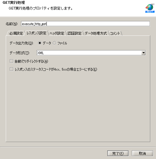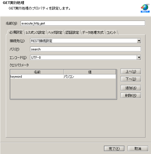 - 「GET実行処理」を使用してWebサービスに対してHTTPのGETメソッドでリクエストを実行します。