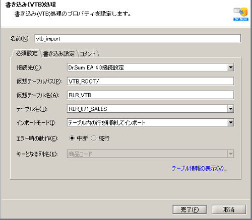 | 書き込み(VTB)処理 | Dr.Sum EA VTB Creatorで作成した仮想テーブルの内容にしたがい、Dr.Sum EAのテーブルに高速でデータを書き込みます。 | 「アプリケーション」-「Dr.Sum EA」-「書き込み(VTB)」 |