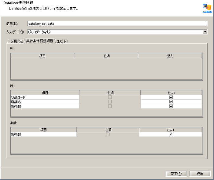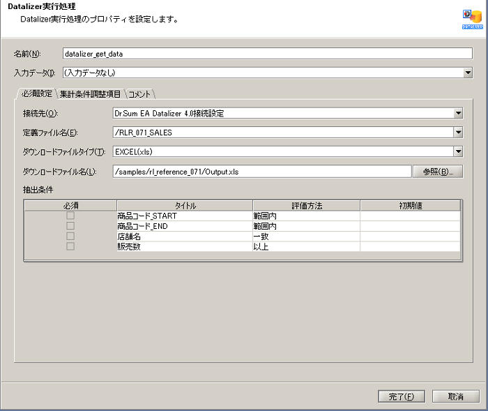 | Datalizer実行処理 | Dr.Sum EA Datalizerの集計結果データを読み取ります。 | 「アプリケーション」-「Dr.Sum EA」-「Datalizer実行」 |