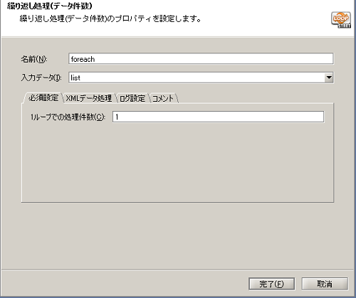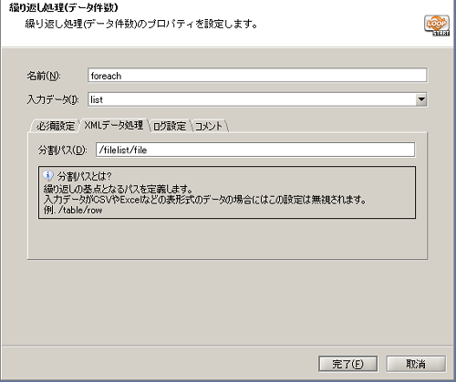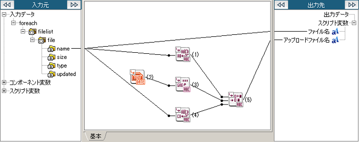 | (2) | 現在日時 | 現在日時を出力します。 | 「日付」-「基本」-「現在日時」 | (3) | 日時フォーマッティング | 日時を指定したフォーマットで出力します。 [必須設定]タブの[フォーマット]には「-yyyy-MM-dd.」を入力します。 |