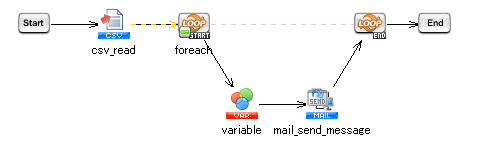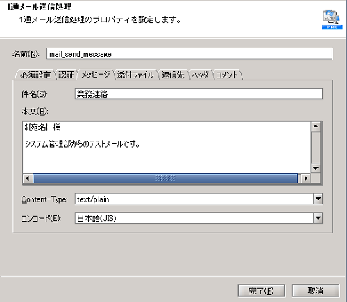 | 1通メール送信処理 | SMTPサーバに1通のメールを送信します。 | 「ネットワーク」-「メール」-「1通メール送信」 |
