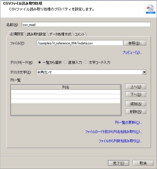 - CSVファイル読み取り処理の設定は、以下のように行います。