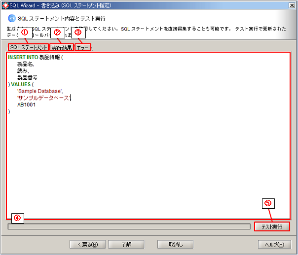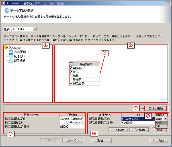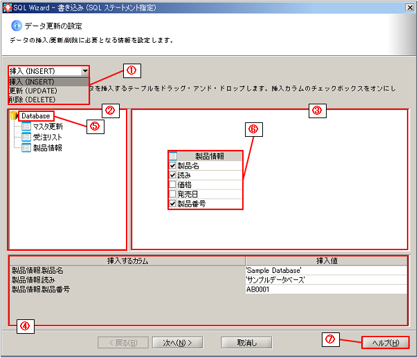 | (7) | ヘルプ | ヘルプを起動し、SQLウィザード(更新系)のページを表示します。 |