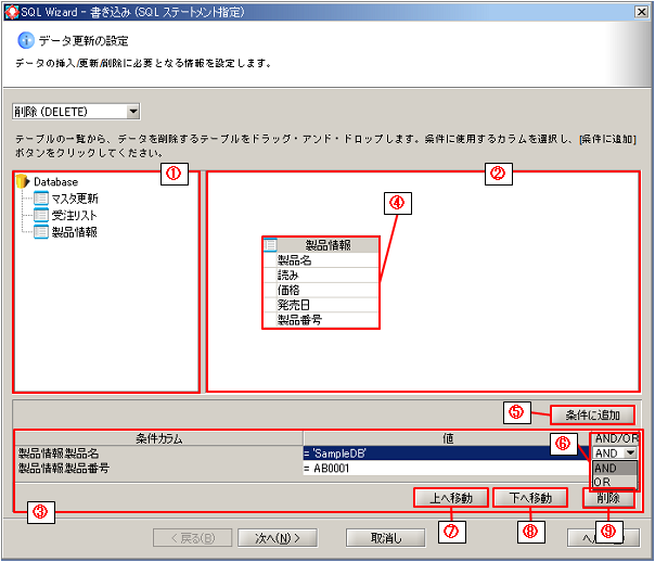 | (9) | 削除 | 条件カラムから書き込みカラムを削除します。 |