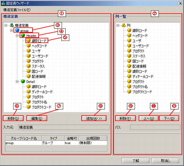 | (6) | 削除(構造定義) | [構造定義]ツリーで選択された要素を削除します。 |