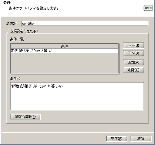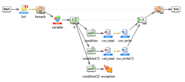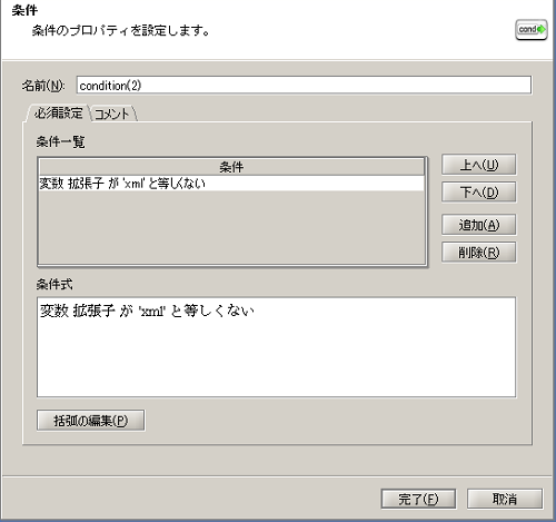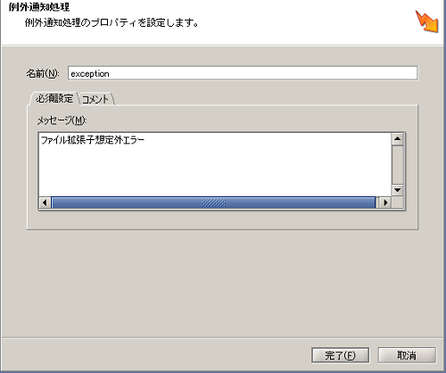 - 拡張子がそれ以外の場合、「例外通知処理」を使用して処理を異常終了させます。