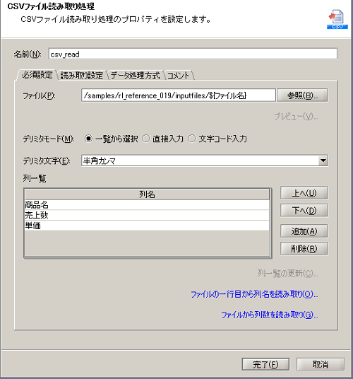 - CSVファイル読み取り処理の設定は、以下のように行います。