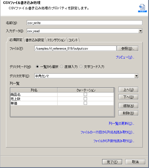 - CSVファイル書き込み処理の設定は、CSVファイル書き込み処理「csv_write」と同様に行います。