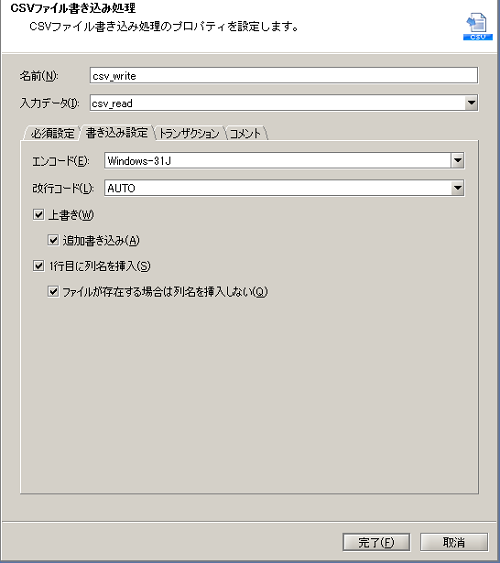 - CSVファイル書き込み処理の設定は、以下のように行います。