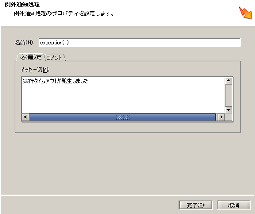 - デザイナのツールパレット「基本」-「処理」-「例外通知」から、例外通知処理をスクリプトキャンバスに配置します。