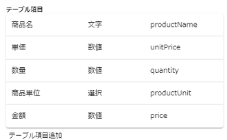 テーブル型データ項目内に定義するテーブル項目(サブデータ項目)の項目名を表示します。 [テーブル項目追加]ボタンを押下してテーブル項目を追加できます。