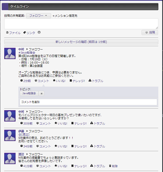 ユーザに関連したつぶやきを一覧表示します。 ユーザがフォローしているつぶやき、ユーザおよびユーザの組織へのメンション(直接のメッセージ)が表示されます。 フォロワーあるいは自分が所属する組織に向けて、つぶやきを投稿します。 |