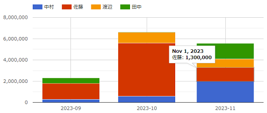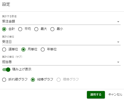 また、[積み上げ表示]にチェックを入れることで、選択した凡例の値をグラフ上で積み上げ表示します。