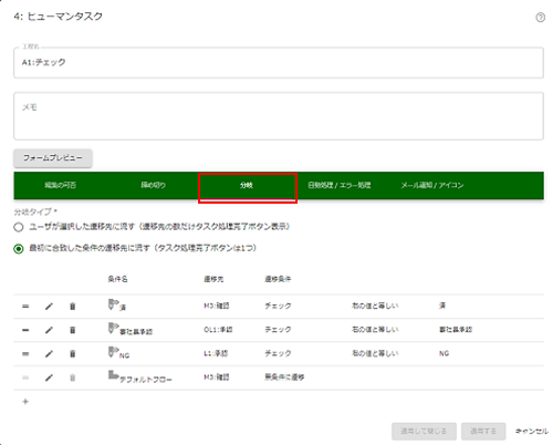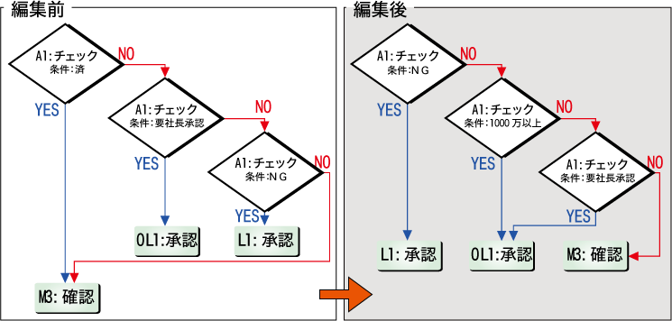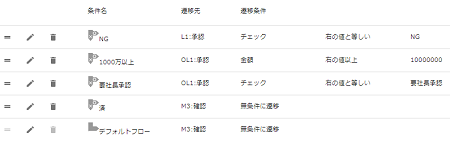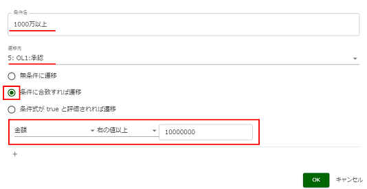 これで分岐の編集は終了です。 この編集によって判定順序と分岐設定を修正し、新しく「1000万以上」という条件が増えました。 |