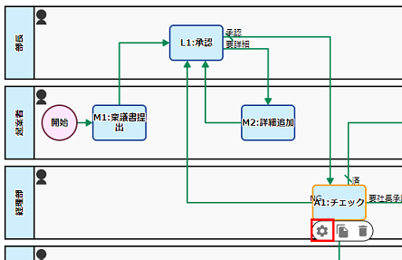 ワークフロー図の「A1:チェック」タスクをクリックし、表示されたメニューの[歯車]アイコンをクリックすると、タスクのプロパティが表示されます。 |