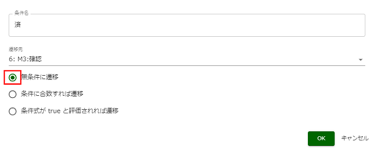条件名「済」の[編集]を選択し、[条件に合致すれば遷移]を[無条件に遷移]に変更します。 |