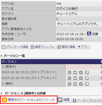 アプリ編集画面が終了すると、アプリ設定詳細画面が表示されます。 ワークフロー図の上に表示される[開発中のバージョンのリリース]ボタンを押下して、アプリを稼働させます。 |