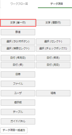 画面左側の選択ボックスの中から、[文字(単一行)]を選択します。 文字型のデータ項目が追加されます。 |