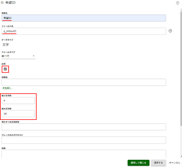 追加したデータ項目の設定を以下の内容に変更します。
