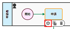 メニュータブからワークフロー図設定画面に戻り、タスク[申請]を押下します。 表示されたメニューの[歯車]アイコンを押下すると、ヒューマンタスクのプロパティが表示されます。 (説明)